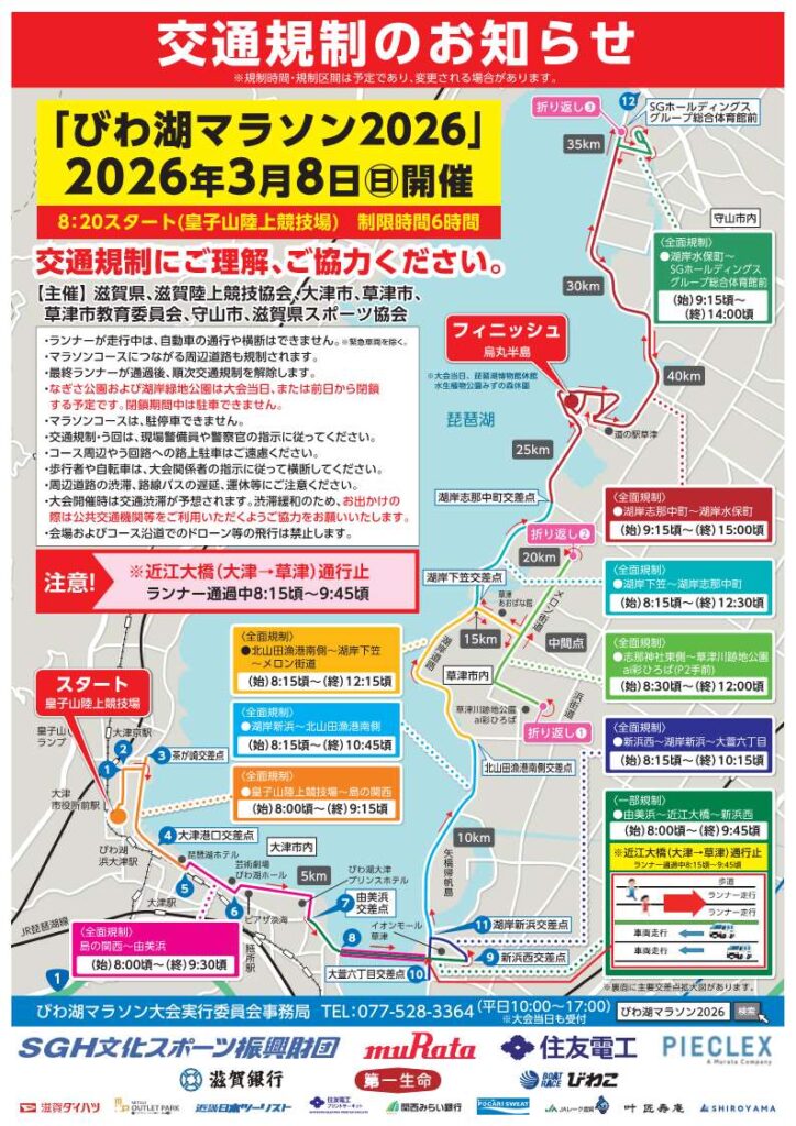 「びわ湖マラソン2026」の開催に伴い、令和8年3月8日(日)は大津市・草津市・守山市の