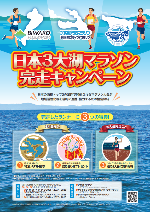 昨年7月末にびわ湖マラソン、かすみがうらマラソン兼国際ブラインドマラソン、 サロマ湖100kmウルトラマラソンが、地域の活性化等を目的とした連携協定を締結いたしました。